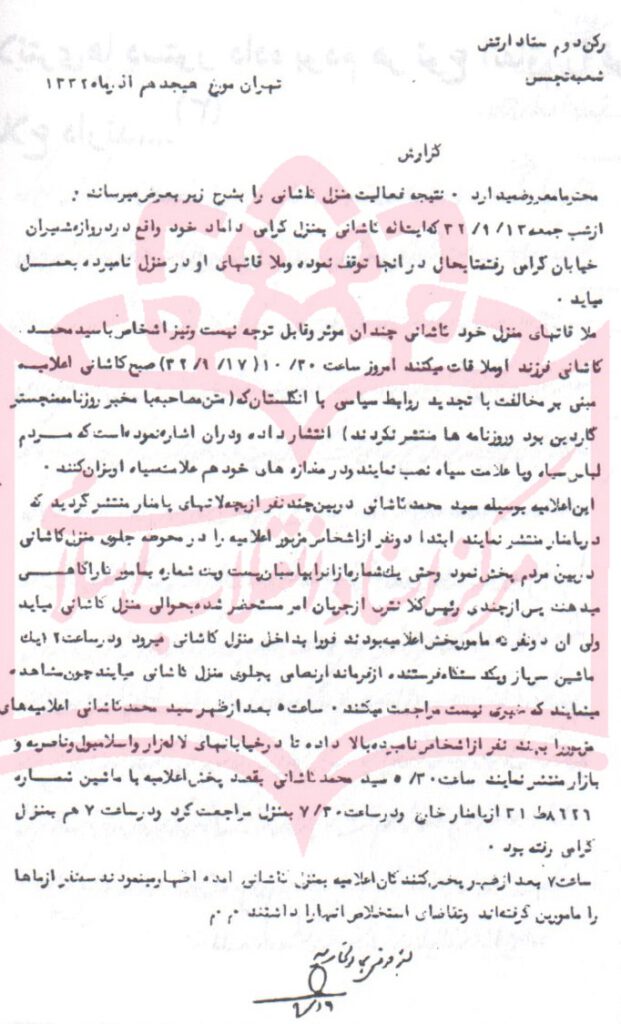 این گزارش همچنین درباره نحوه توزیع اعلامیه فوق افزود: «…دو نفر از اشخاص مزبور اعلامیه را در محوطه جلوی منزل کاشانی در بین مردم پخش نموده و حتی یک شماره از آن را به پاسبان پست و یک شماره به مامور کارآگاهی می دهند. پس از چندی رئیس کلانتری از جریان امر مستحضر شده، به حوالی منزل کاشانی می آید ولی آن دو نفر که مامور پخش اعلامیه بودند، فورا به داخل منزل کاشانی می روند. در ساعت 12 یک ماشین سرباز و یک دستگاه فرستنده از فرماندار نظامی به جلوی منزل کاشانی می آیند، چون مشاهده می نمایند که خبری نیست، مراجعت می کنند. ساعت 5 بعدازظهر سید محمد کاشانی اعلامیه های مزبور را به چند نفر از اشخاص نامبرده بالا داده تا در خیابان های لاله زار و اسلامبول و ناصریه و بازار منتشر نمایند…»