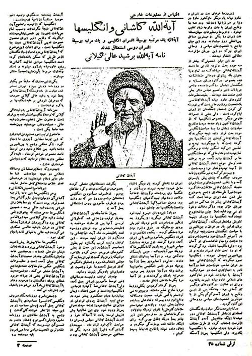 یکی از این مدارک که سابقاً یک بار هم در روزنامه «دیلی نیوز» تهران منتشر شده عبارت از نامهای است که آیتالله کاشانی به خط خود به رشید عالی گیلانیِ معروف، که در عراق شورشی بر علیه انگلیسها برپا کرده نوشته است.
