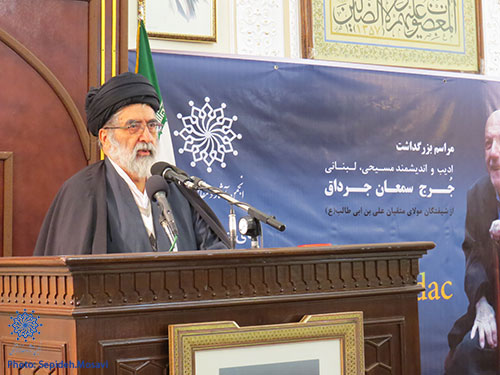 وی افزود: جرج جرداق شیعه نشد و حتما نباید کسی که از امام علی (علیه السلام) سخن می گوید شیعه باشد. امام علی (علیه السلام) فرازمانی و فرامکانی و فرادینی می باشد. وقتی جرداق به دنیا می آید یک بحران فکری در همه کشورهای توسعه نیافته و در بین مسلمانان وجود داشت و آن بحران شدید هویت و بحران فکری بود. در این زمانه بحران، تنها کسی که توانست پاسخگوی این زمان باشد سخنان امام علی (علیه السلام) بود. درحالی که عالمان ما نتوانسته بودند کار خود را در معرفی امام علی (علیه السلام) انجام دهند این جرداق بود که توانست با بهترین زبان امام علی (علیه السلام) را نه برای مسلمانان و شیعیان که حتی بر جهانیان به عنوان عامل نجات بشر معرفی کند.