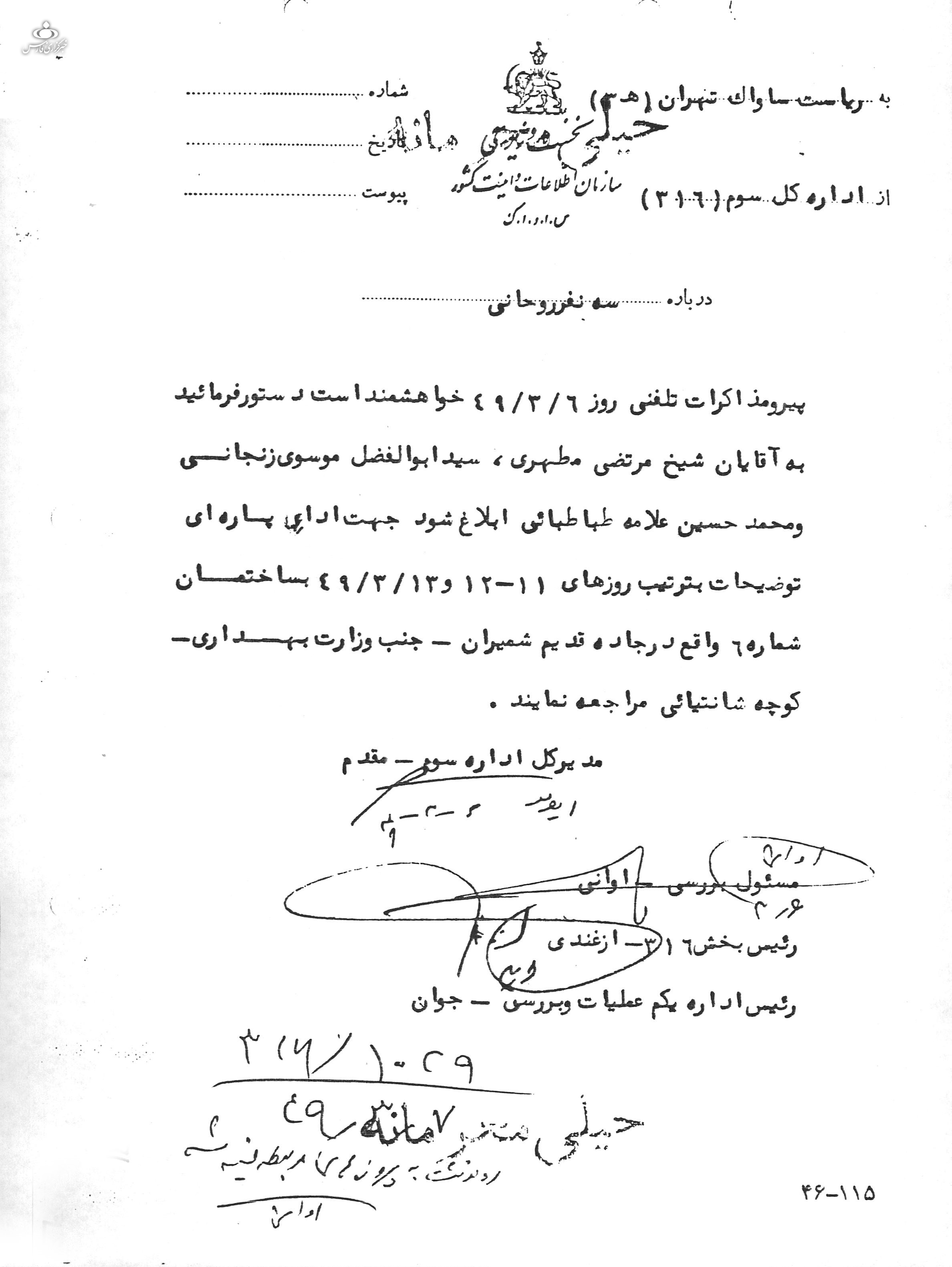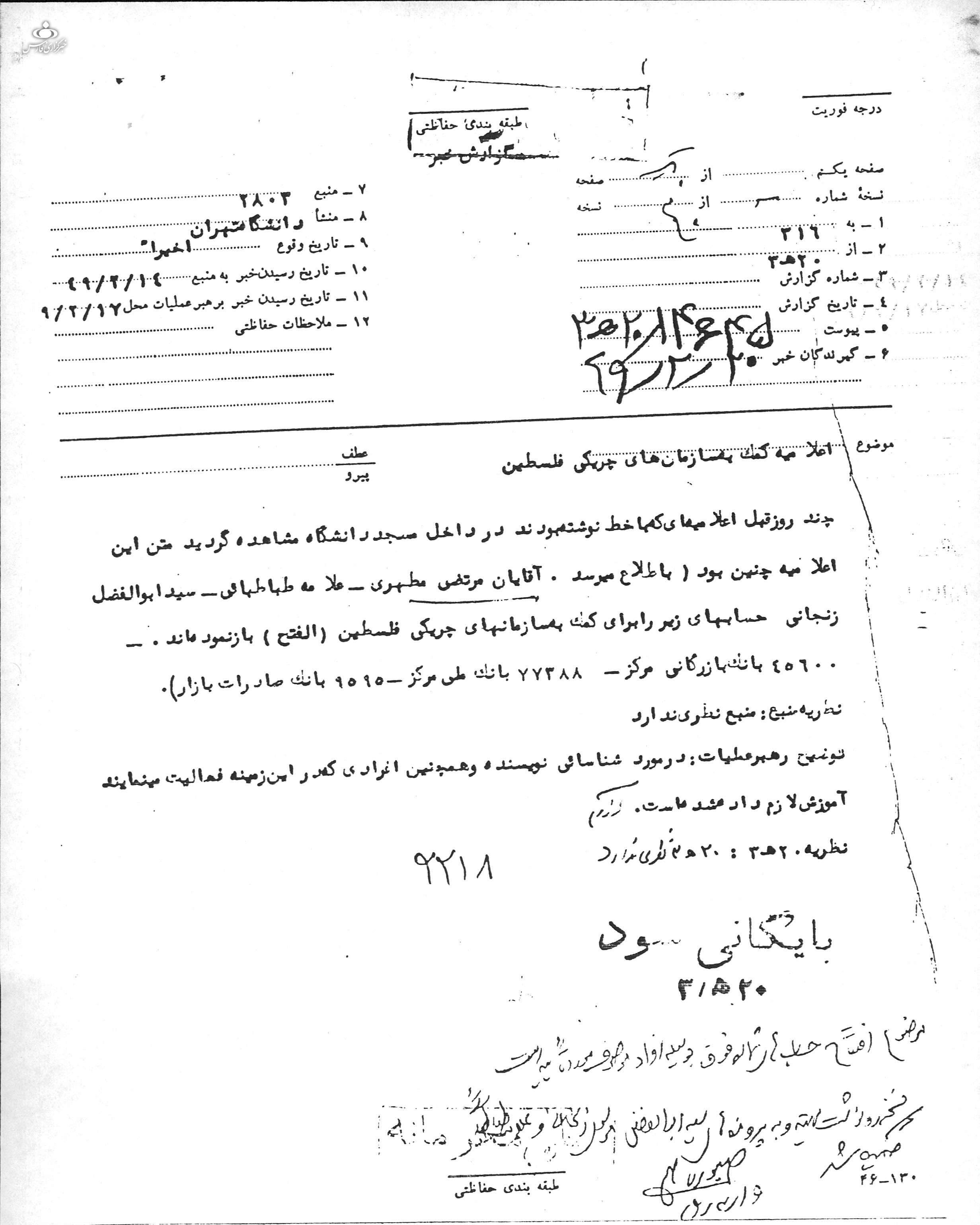 ساواک این عمل را که در اردیبهشت ماه سال ۱۳۴۹ صورت گرفته است، گزارش کرده است. در این اسناد منتشر نشده که از طریق مؤسسه مطالعات و پژوهش های سیاسی در اختیار فارس قرار گرفته آمده است: «چند روز قبل اعلامیه ای که با خط نوشته بودند، در داخل مسجد دانشگاه مشاهده گردید؛ متن این اعلامیه چنین بود: (به اطلاع می رسد آقایان مرتضی مطهری، علامه طباطبایی، سید ابوالفضل زنجانی حساب های زیر را برای کمک به سازمان های چریکی فلسطین (الفتح) باز نموده اند.)»
