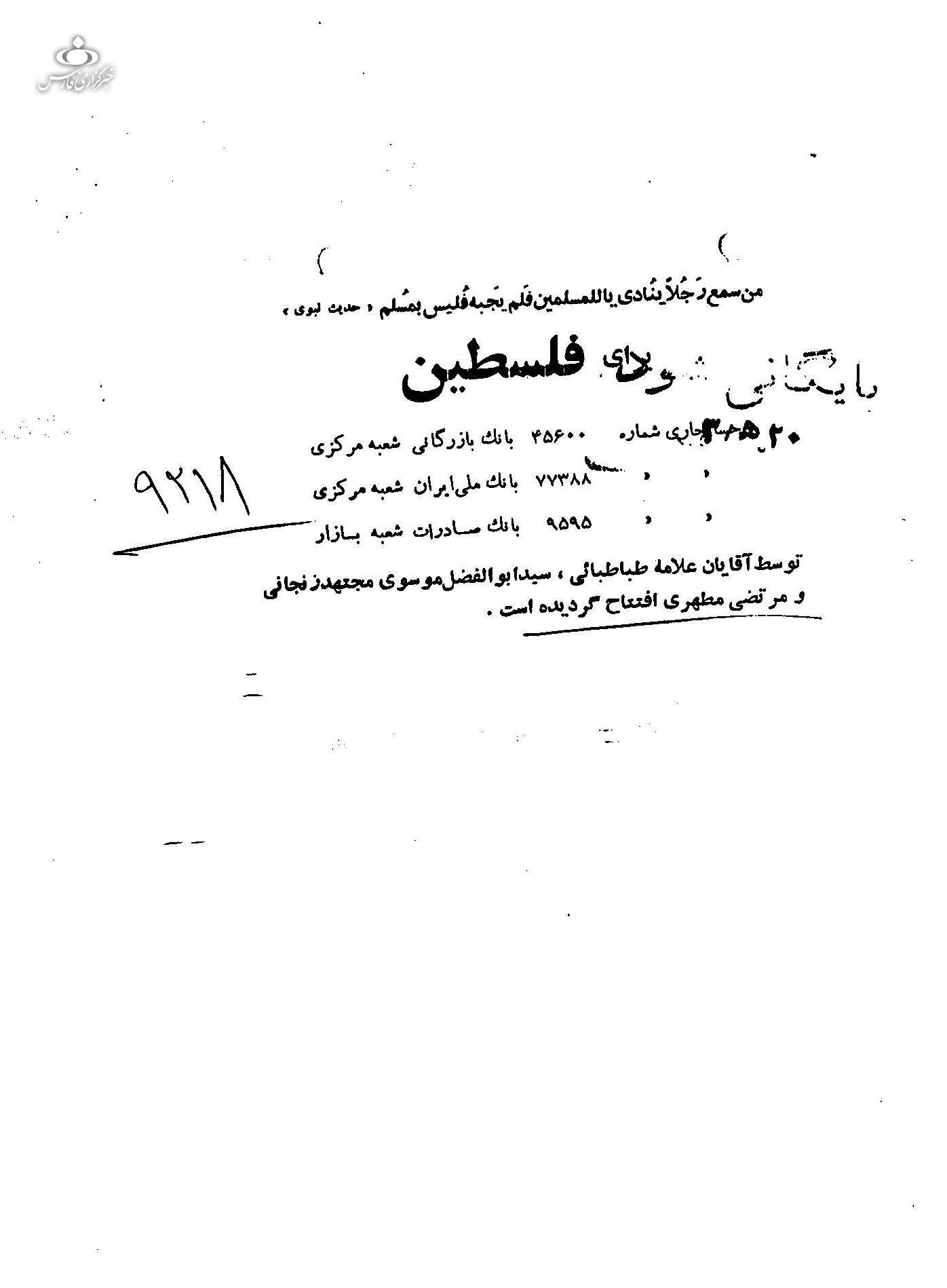 حسابی که علامه طباطبایی برای کمک به فلسطین باز کرد همراه با سند