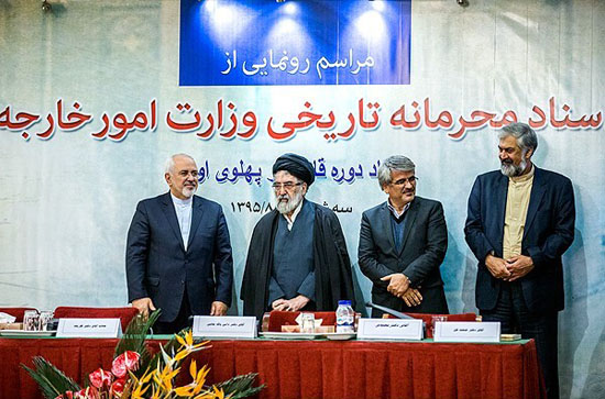 محمدجواد ظریف در آیین رونمایی از اسناد تاریخی محرمانه وزارت خارجه که با حضور شخصیت های برجسته فرهنگی و سیاسی و استاد سید هادی خسروشاهی در دفتر مطالعات برگزار شد، خطاب به حاضران افزود: حضور شما را در مراسم رونمایی از گوشه ای از اسناد تاریخی محرمانه وزارت خارجه که بر اساس مقررات و با نگاه به مصالح ملی در اختیار پژوهشگران قرار داده می شود، خوش آمد عرض می کنم. این مناسبت را به همکارانم در مرکز اسناد و تاریخ دیپلماسی و به همه دست اندرکاران امر سند و به تمامی مراکز اسنادی و آرشیوی کشور به ویژه اعضای مجمع هماهنگی تاریخ پژوهی و بانک‌های اسنادی کشور (مهتاب) تبریک می گویم.